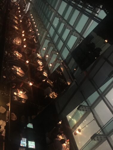 We left the ICC tower without even being able to see it from the bottom up, as more than half of it was covered by fog! We asked at the Ritz Carlton a good place to see the lights show, that starts at 8pm and where all the skyscrapers have a show of their lights… They sent us to a bar called Aqua, (which is of the same league of the Ritz Cartlon) and was only on the 30th floor and is the sister bar of Aqua in London. We had a beer for £10 but at least got double free nibbles to make up for it as we drank really slowly.